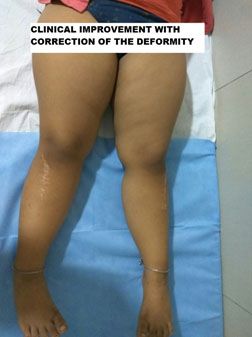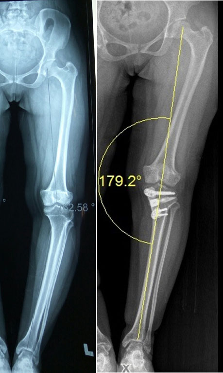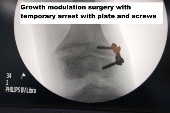 If there is adequate growth left ( age between 10-12 years), then the deformity can be treated with a simple surgery where the growth plates are temporarily held without growth by using plates that prevent bone from growing, and thereby deformity can be corrected.