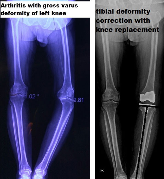 Elderly patients do present with bow legs due to osteoarthritis changes in the joint and significant deformity with functional deficits when no other treatment is possible; then a joint replacement surgery is offered for correction of deformity as well as treatment for arthritis.