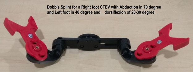 Bracing with Foot Abduction Orthosis- 22-23 hours for three months and later night time bracing for 3-4 years Dennis brown Splint/ Dobb’s splint are orthosis that helps maintain the correction of the deformity. The splints keep the affected foot in a 60-70 degree of external rotation and 20-30 degrees of dorsiflexion. The primary difference between the DB splint and the Dobb’s is the ability to move the feet independently in Dobb’s splint while both feet move together in Dennis Brown splint.