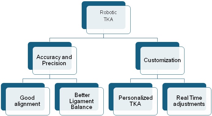 The last decade has seen a dramatic shift in the usage of robotic in total knee replacement(TKR). In India the scenario has dramatically altered in the last couple of years with the widespread usage of robotics to improve outcomes in TKR. The advantages of TKA have been shown in the flow chart below.