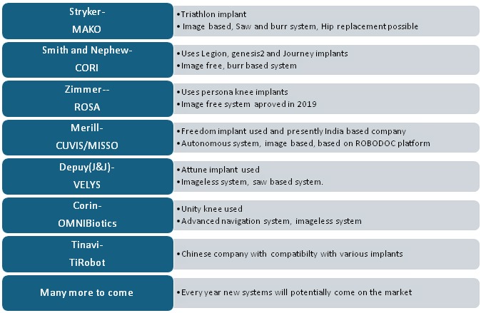 The robotic platform available widely in the world and India has been mentioned in the table below. This is a rapidly evolving subject, and many more platforms are going to be developed in the world of knee replacement surgery. The table below summarizes the implant and the manufacturing companies presently around the world in total knee arthroplasty.