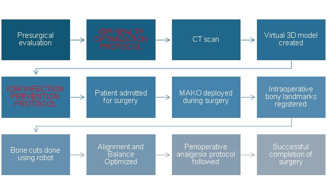 The workflow of a MAKO robotic knee replacement surgery is shown in the chart which will give an idea of how a robotic TKA helps in achieving the desired objective.